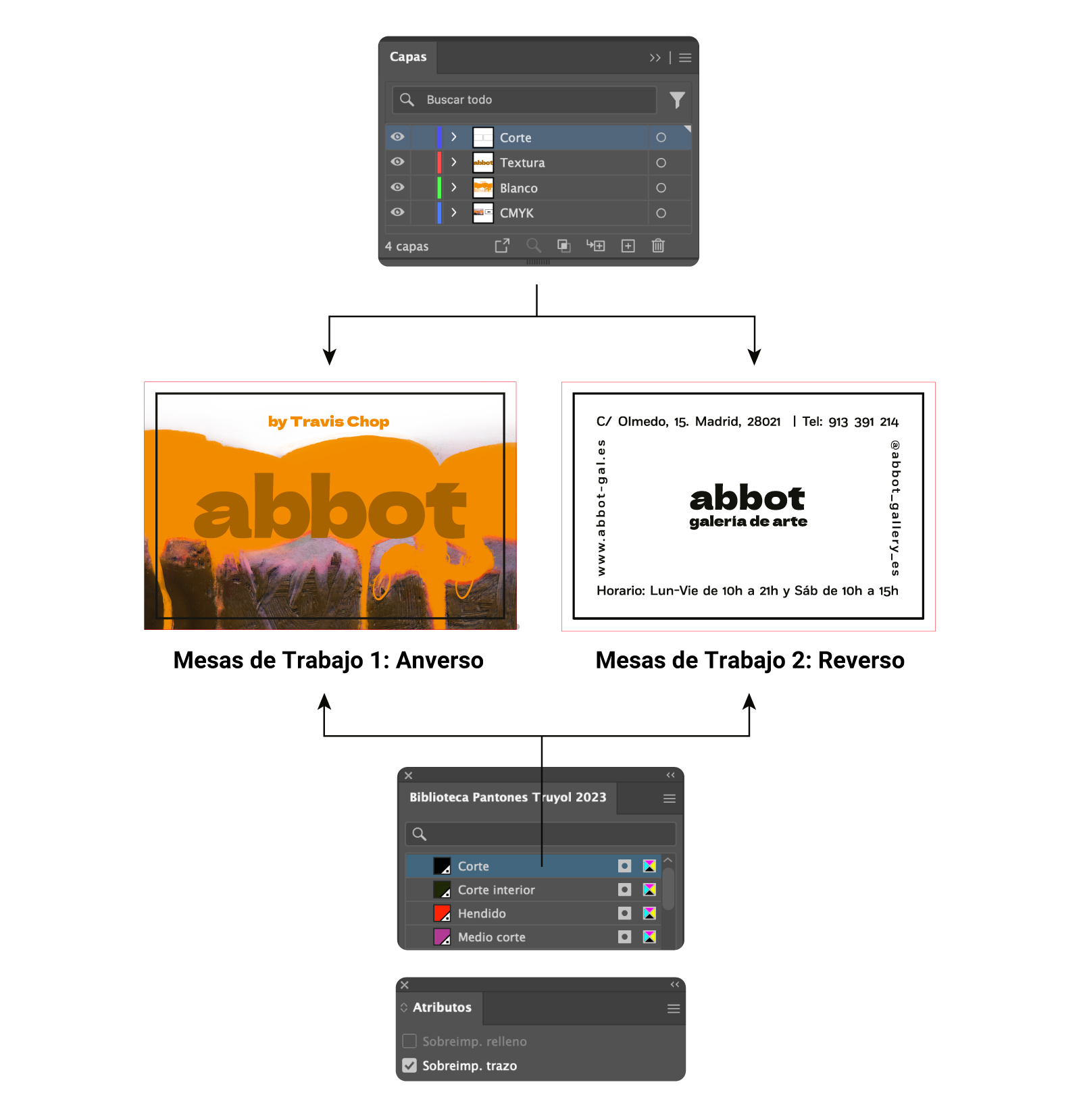 2.4- Por último, añade una capa con la línea de troquel, común para ambas caras de la tarjeta. Aplica la tinta plana “Corte” desde de la Biblioteca de Tintas Técnicas de Truyol con la opción de sobreimprimir activa en trazo.