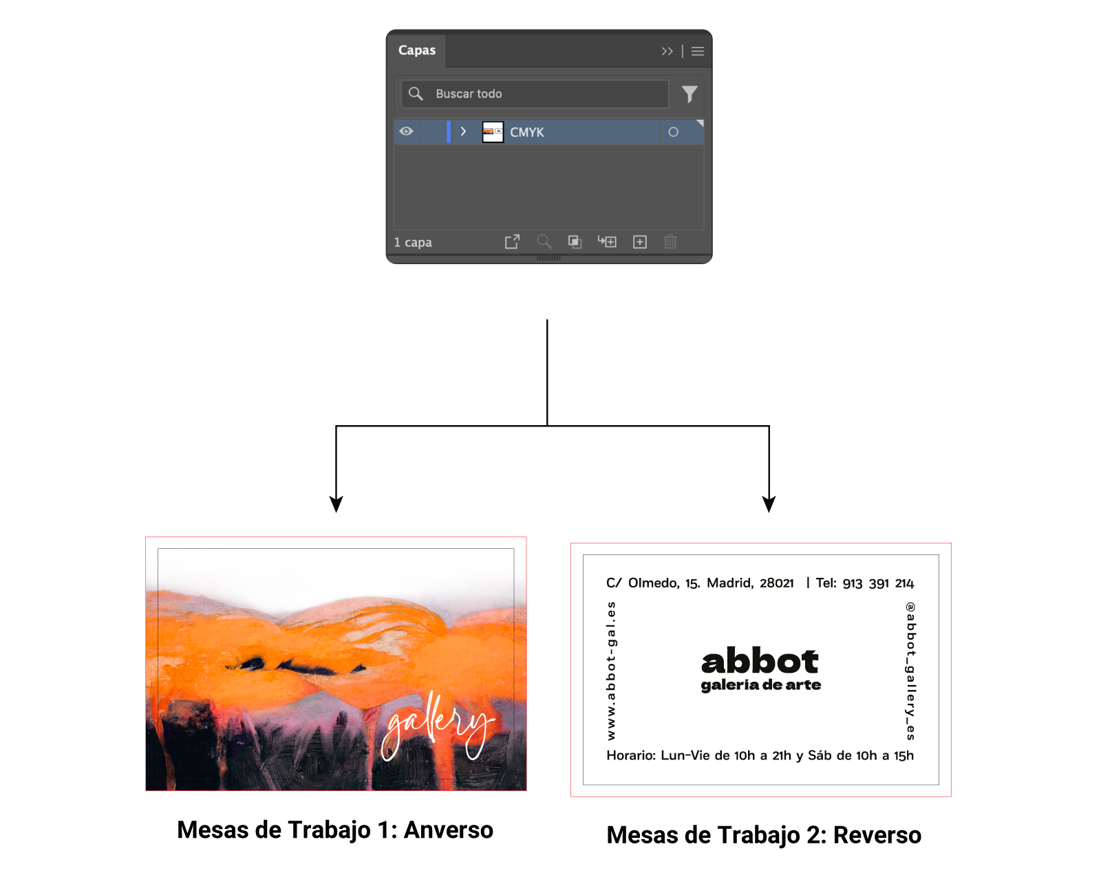2.1- Crea una capa para la parte del diseño en CMYK. Aquí se inserta la parte del diseño en CMYK de cada cara de la tarjeta en la mesa de trabajo correspondiente.