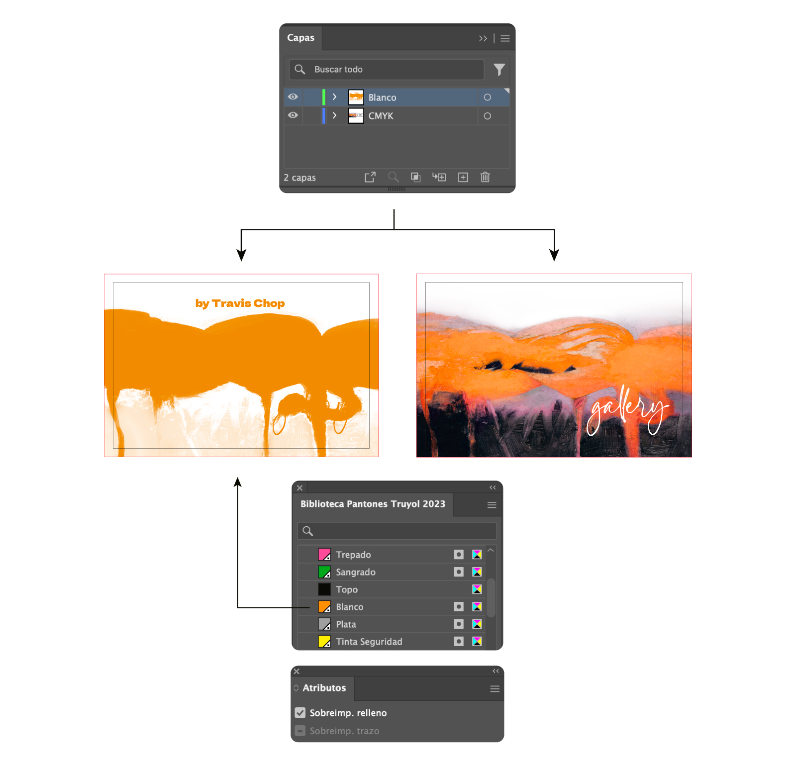 2.2- Añade otra capa para la parte del diseño que se imprime con tinta blanca y aplica la tinta plana “Blanco” desde de la Biblioteca de Tintas Técnicas de Truyol con la opción de sobreimprimir activa en relleno y trazo.