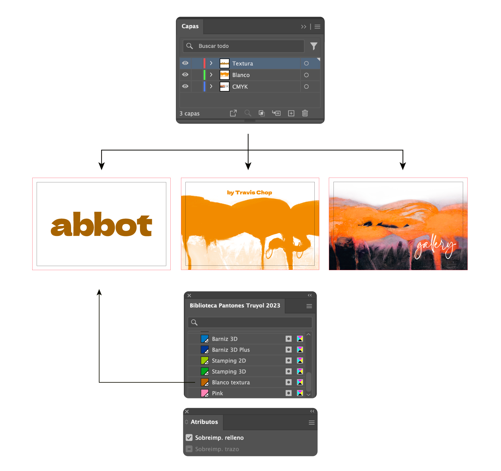 2.3- Crea una tercera capa e inserta la zona impresa con textura de tinta blanca. Rellénala con la tinta técnica “Blanco Textura” desde de la Biblioteca de Tintas Técnicas de Truyol con la opción de sobreimprimir activa en relleno y trazo.