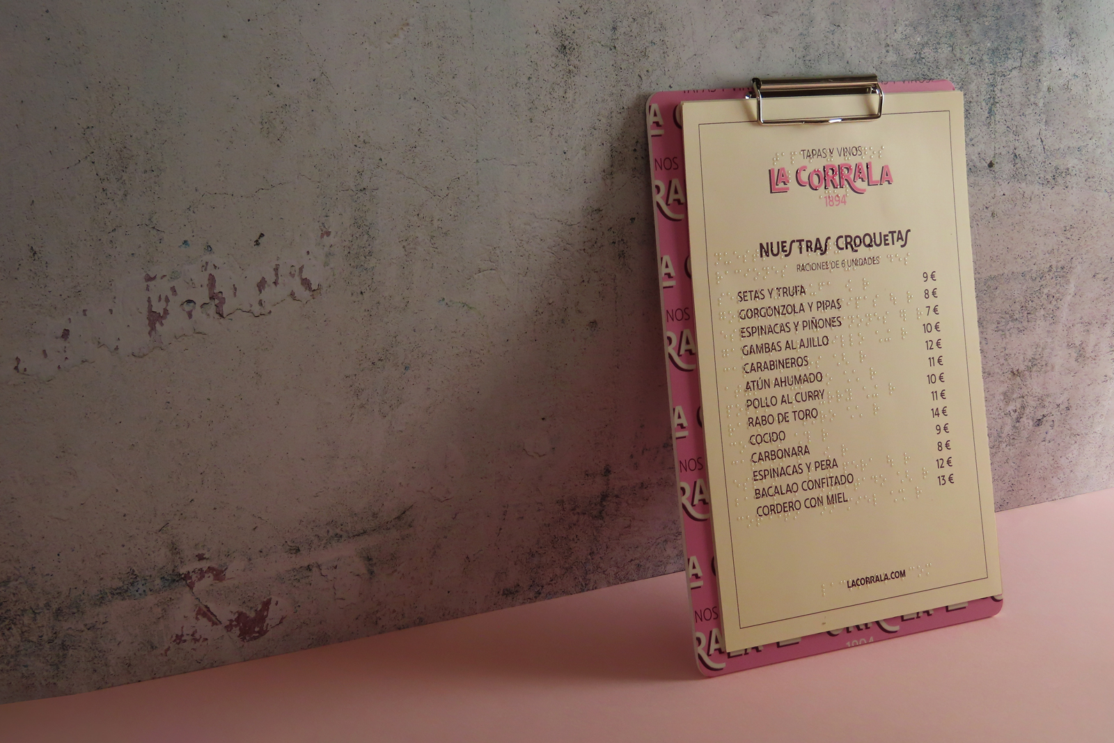 El barniz que se utiliza en la impresión de braille sólido es incoloro. Esto permite introducir la cecografía sin que interfiera en el diseño. La técnica de braille sólido tampoco influye en la experiencia del cliente ya que el texto se puede leer perfectamente como se ve en esta carta restaurante con pinza. Es más, seguramente la percepción del cliente sobre el negocio mejore notablemente gracias a este gesto de responsabilidad social corporativa.
