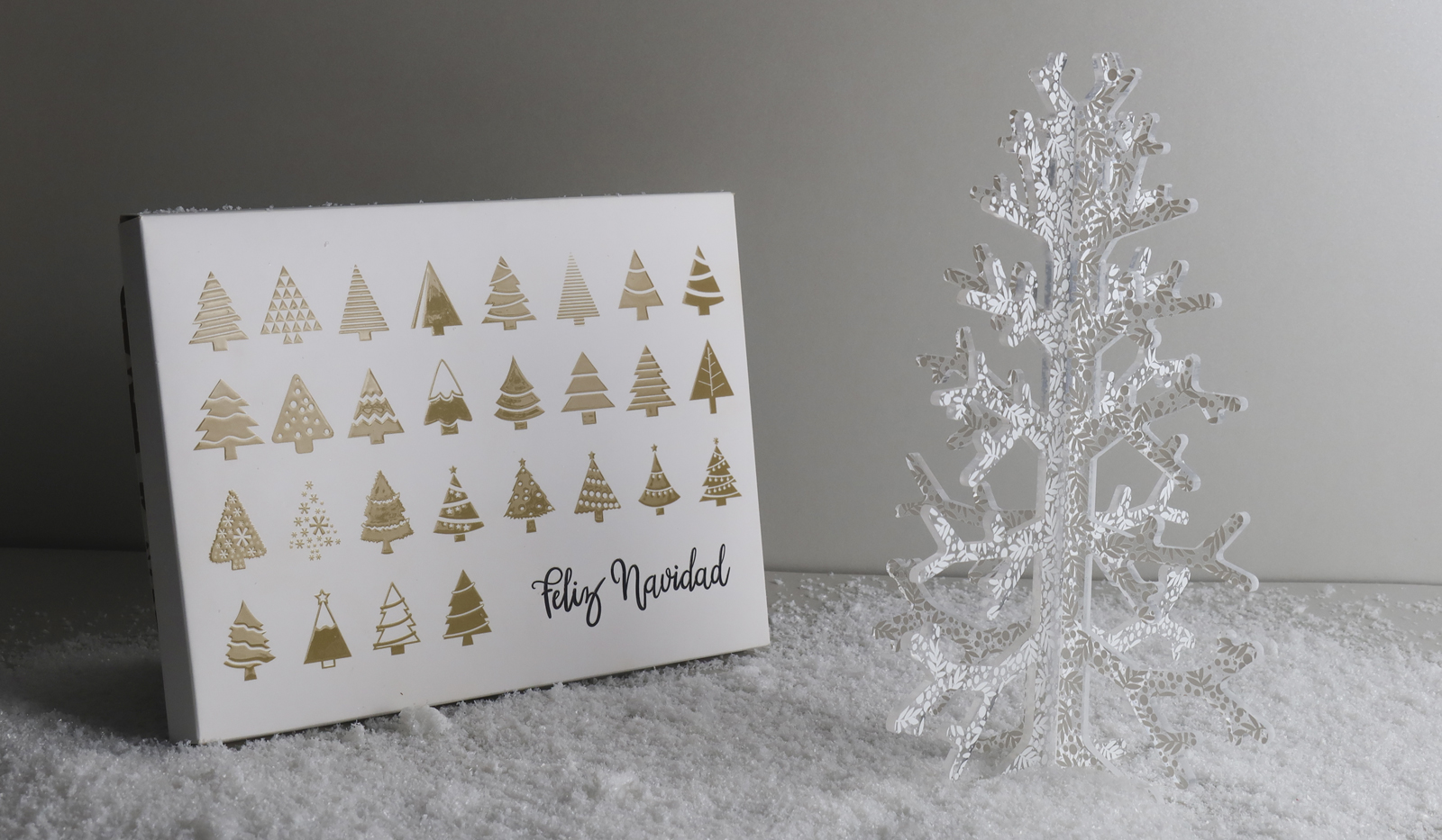 ¿Y si la felicitación pudiera construirse? Esta se presenta en una caja sobre con árboles barnizados. En el interior se encuentra un kit navideño que incluye: