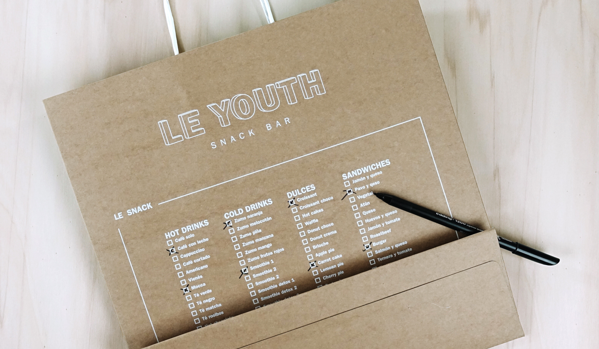 Dentro de Le Youth hay dos espacios gastronómicos diferenciados: el snack bar y el restaurante. El primero está ideado con un concepto totalmente informal, de cafetería, comida rápida y servicio Take Away, enfocado para viajeros urbanos, pero también locales. La propuesta gastronómica es la principal experiencia para el comensal, pero esta ha de verse reflejada, apoyada y potenciada con los elementos visuales: decoración y branding.