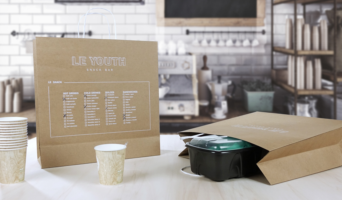 Para este concepto se han impreso unas cartas restaurante sobre bolsas de papel con soporte Kraftliner con certificado de sostenibilidad FSC, asas de papel blanco y la especial tinta blanca. El consumidor marca su elección en la misma bolsa en la que le entregarán el pedido. Así, tiene la opción de disfrutarlo en su habitación, en cualquier espacio del hotel, llevárselo a casa, a su oficina o mientras hace turismo. Este concepto, sin duda, marca la diferencia respecto a otros similares gracias a su estética orgánica, dinámica y sencilla que convierte la experiencia en esta cafetería emocionalmente diferente a través de un servicio regular apoyado por una estética única.