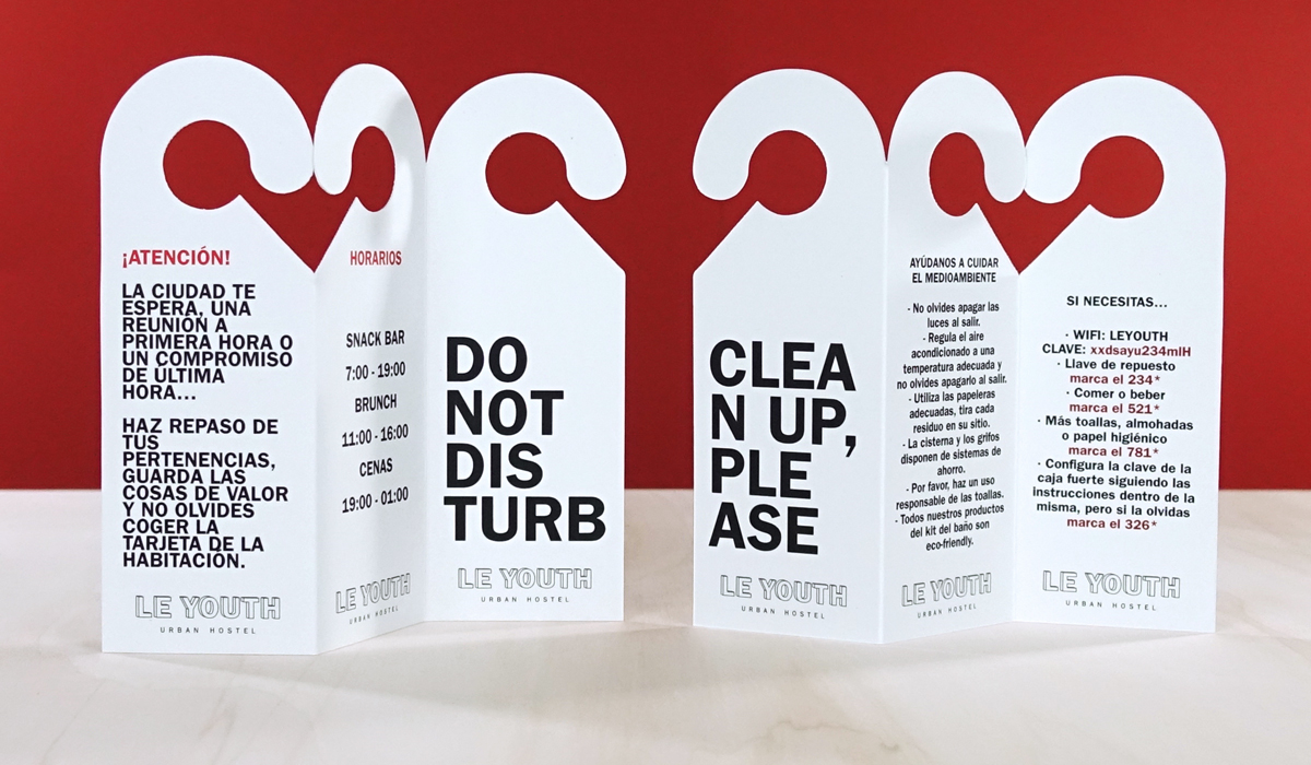 En lo que nos atañe, el diseño del branding, su imagen visual y la elección de los materiales es muy relevante para no perder esa coherencia. Te mostramos todo esto a través de Le Youth, un hotel con apariencia de hostel urbano, con un diseño minimalista pero cálido, decorado con materiales nobles – ladrillo y madera como acabado-. El alojamiento se dirige a un público millennial, un consumidor preocupado por el medio ambiente, que busca experiencias y un entorno agradable donde alojarse en sus viajes de negocios o mientras descubre una ciudad. Le Youth, Urban Hostel, presenta su concepto como un estilo de vida. Sus valores impresos en el material corporativo potencian al máximo la calidad de la experiencia de marca haciendo incidencia muy positivamente en todo el customer journey.
