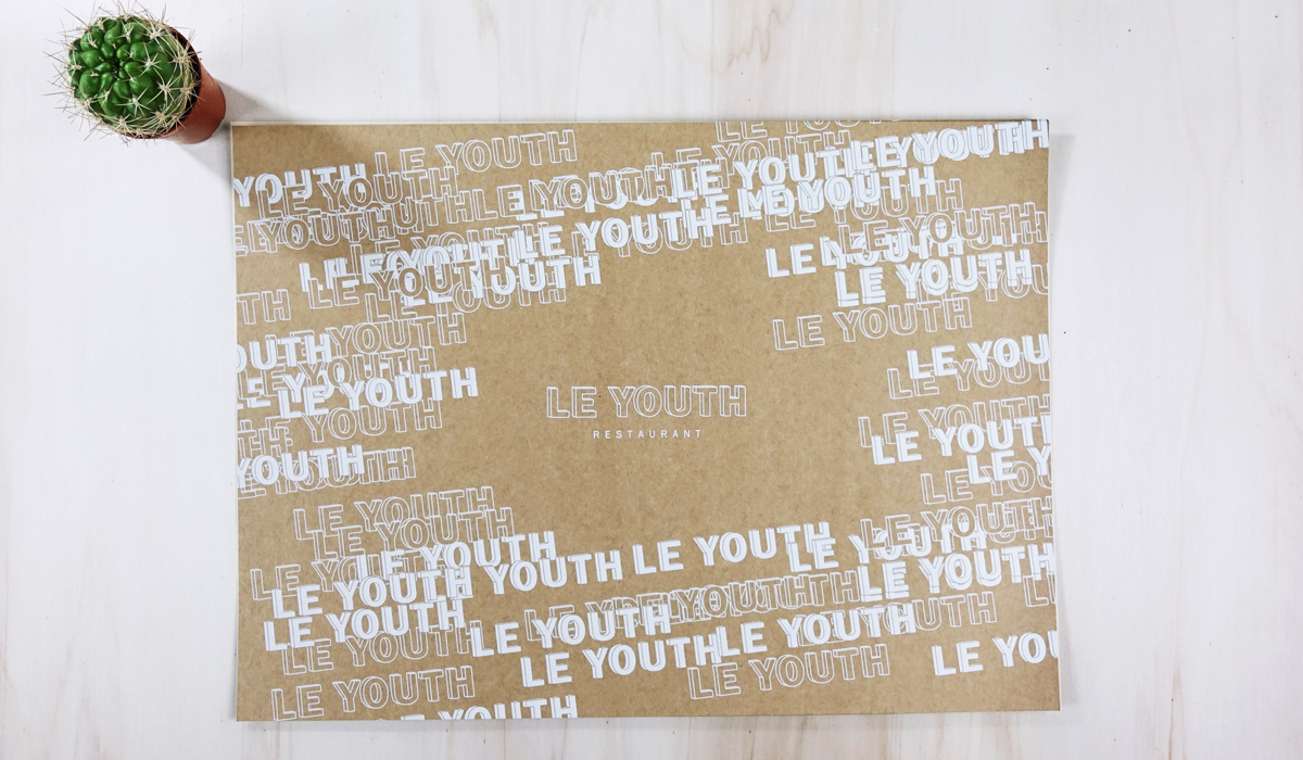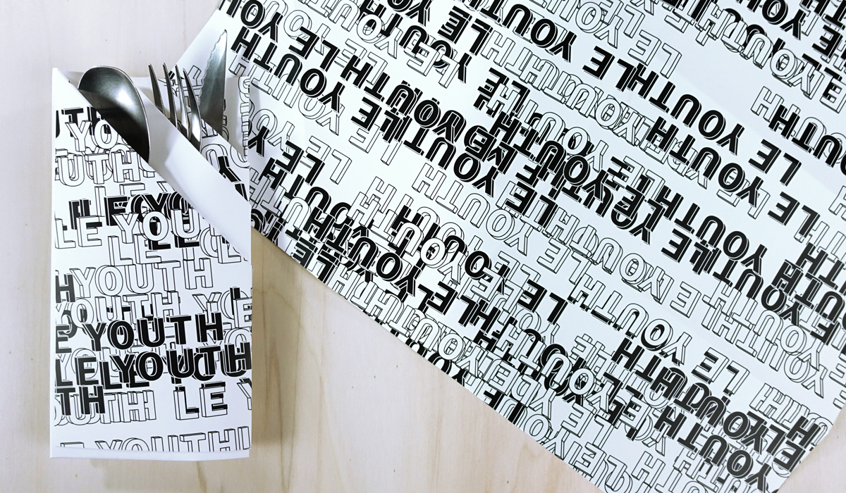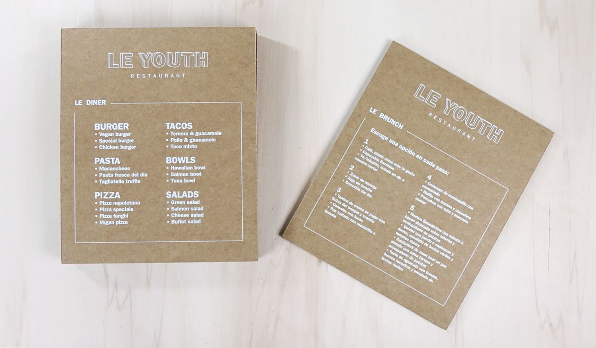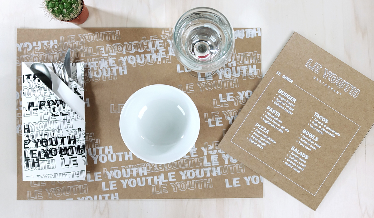 Los consumidores millennials también tienen una gran conciencia medioambiental. La faja para cubiertos está impresa sobre el soporte sintético Yupoblue de 150 µm, muy utilizado en restauración por sus propiedades impermeables y su resistencia, lo que lo hace muy duradero. Además, está compuesto por polímeros lo que hace que sea un soporte 100% reciclable. La pieza se monta a través de una serie de plegados facilitado por los hendidos. En cuanto al mantel, es de papel creativo ecológico kraftliner y está personalizado con tinta blanca.