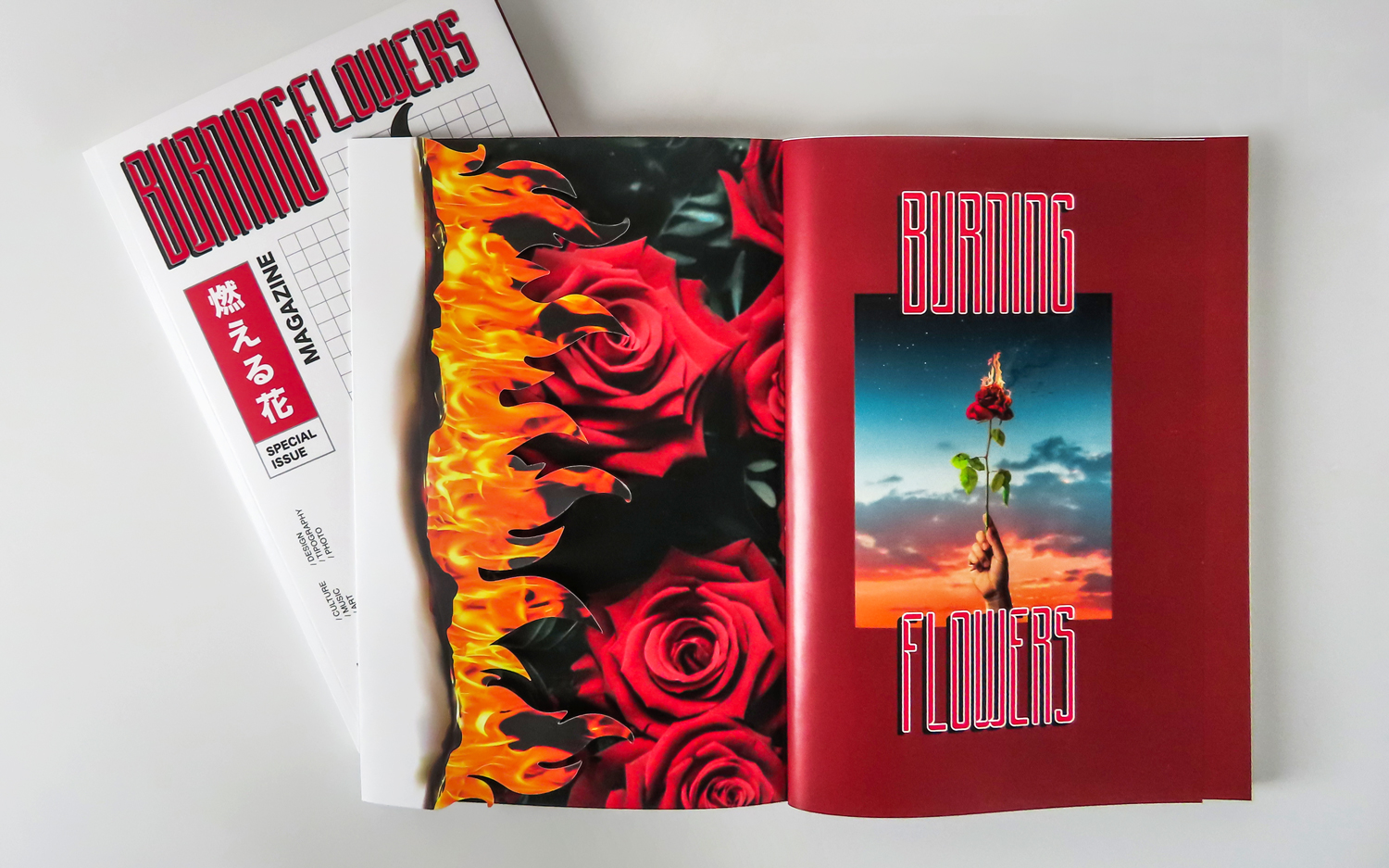 Al abrir el libro, llama la atención unas solapas poco comunes gracias al troquel, que suponen un juego visual en conjunción con la contraportada. Una representación gráfica del nombre de la cabecera: “Flores ardientes”. Las solapas se han impreso a partir de trepados para una combinación friendly entre diseño editorial y tecnología.