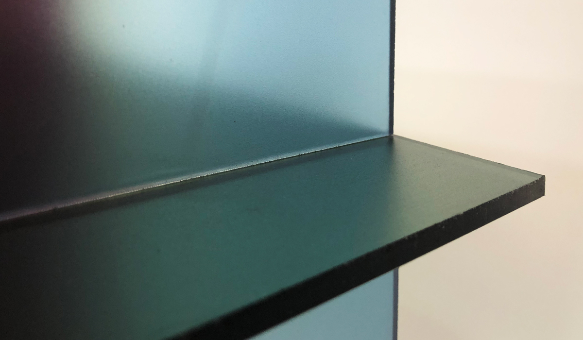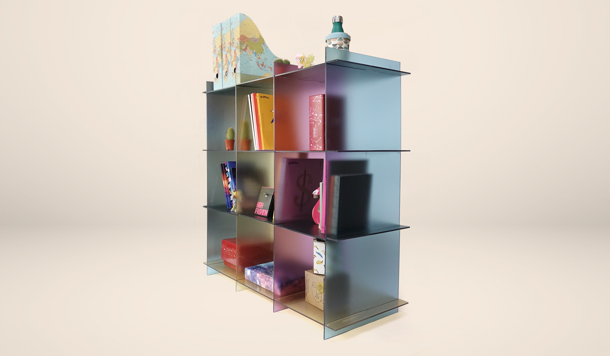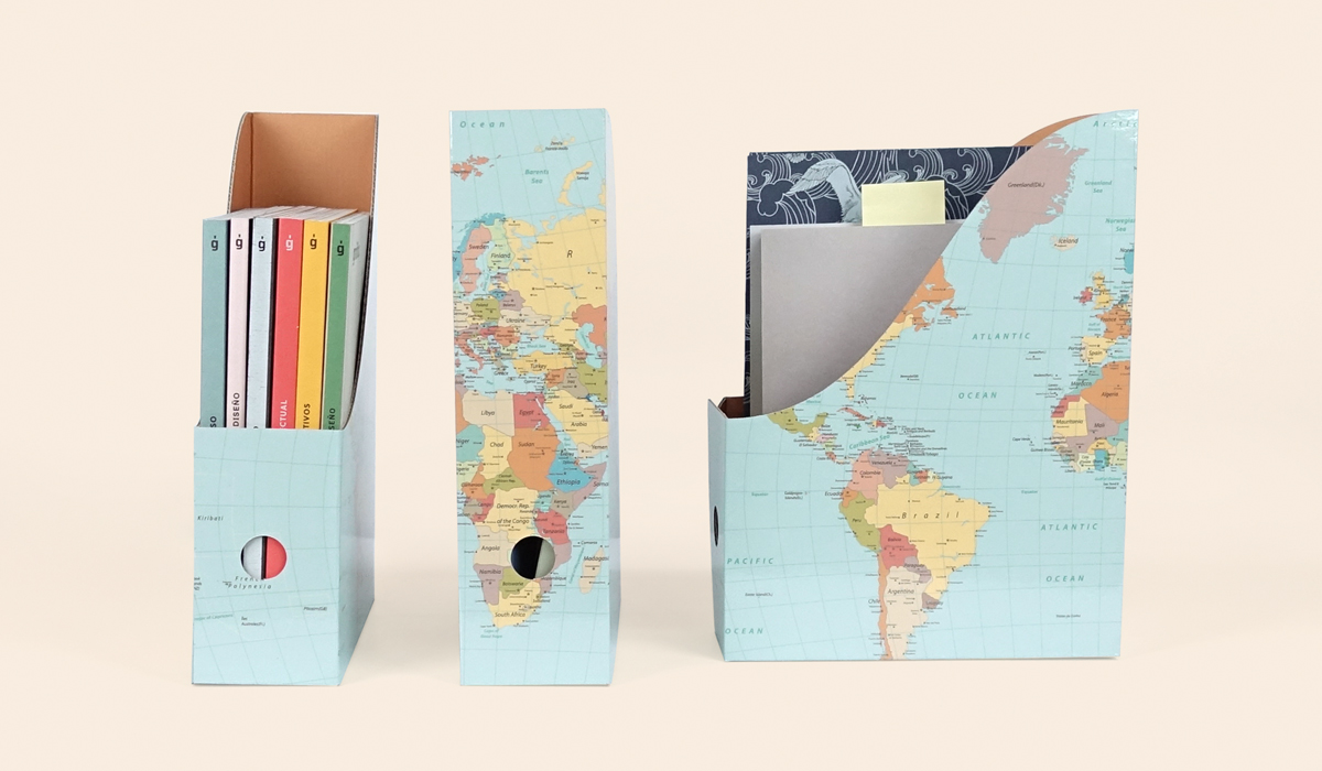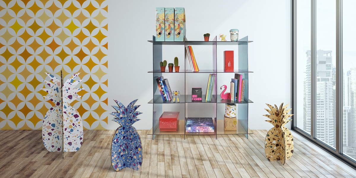 La impresión digital nos permite personalizar un espacio a medida de manera económica como con esta estantería de nueve módulos impresa sobre PET transparente de 5 mm, una forma muy decorativa de poner orden sin perder diseño. En cuestión de disposición, destacan también las carpetas porta-documentos de cartón corrugado.