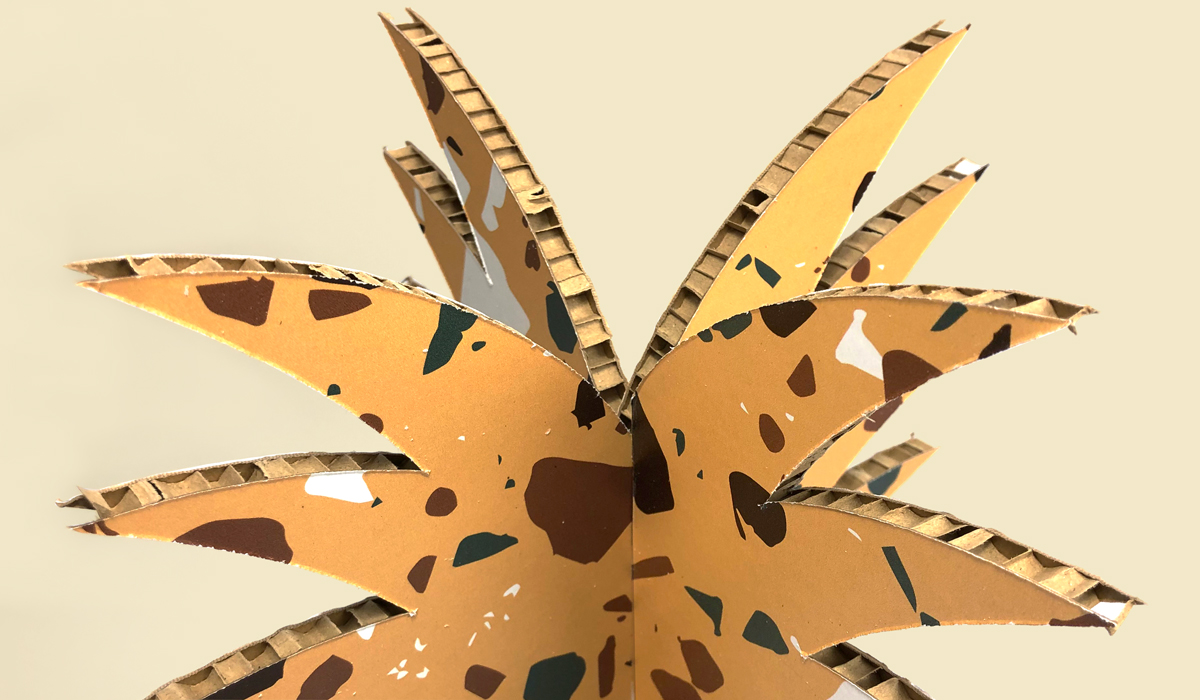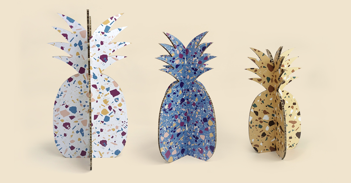 El terrazo continúa siendo tendencia tras su vuelta en 2019. Ahora, no solo se aplica a suelos, su dominio se ha extendido a paredes, piezas decorativas, muebles, menaje… un recurso muy vintage para estar a la última. Lo hemos aplicado a estas piñas impresas sobre cartón nido de abeja, un motivo decorativo que sigue estando en boga desde hace casi una década pero que sigue muy presente.