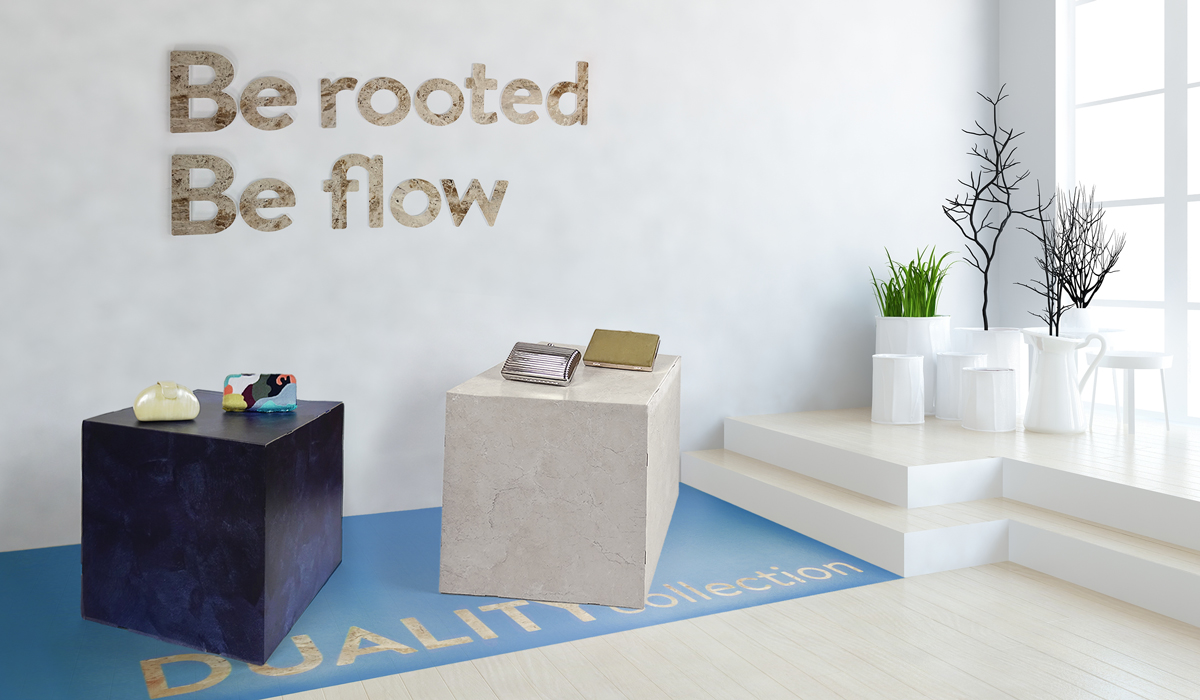 En este caso se ha personalizado un área de una ficticia boutique de bolsos, muy acorde con esta tendencia de interiorismo 2020, para destacar la nueva colección Duality, que resalta el contraste entre el agua y la tierra.