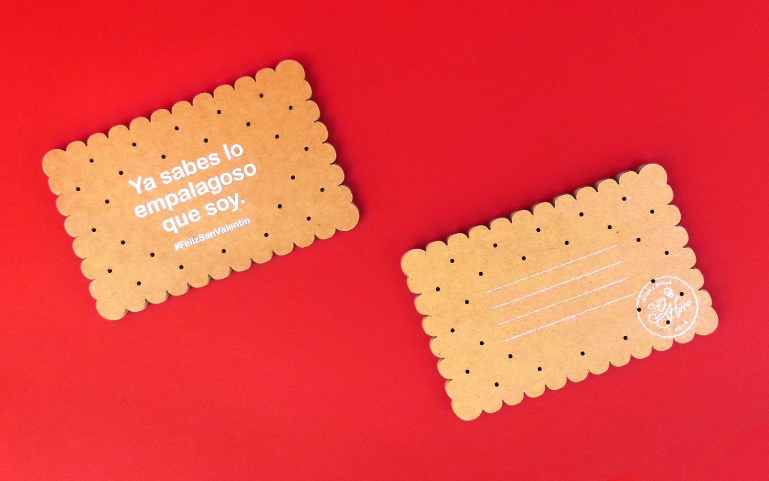 Para la campaña de San Valentín de esta pastelería, se ha impreso una tarjeta postal con forma de galleta con la frase “Ya sabes lo empalagoso que soy” y un espacio reservado en el que el cliente puede escribir a mano su mensaje de amor.